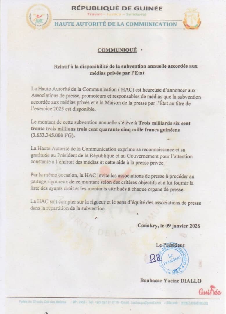 La Haute Autorité de la Communication (HAC) informe les acteurs du paysage médiatique guinéen que la subvention annuelle de l’État, exercice 2026, est désormais disponible.