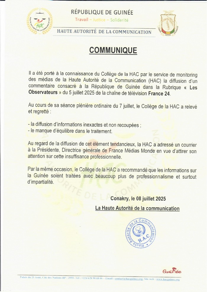 Dans un communiqué publié ce mardi 08 juillet 2025, la Haute Autorité de la Communication a adressé un courrier à la Présidente de France Médias Monde en vue d’attirer son attention sur une insuffisance professionnelle de France 24 à propos de la diffusion d’un commentaire sur la Guinée dans la rubrique les Observateurs.