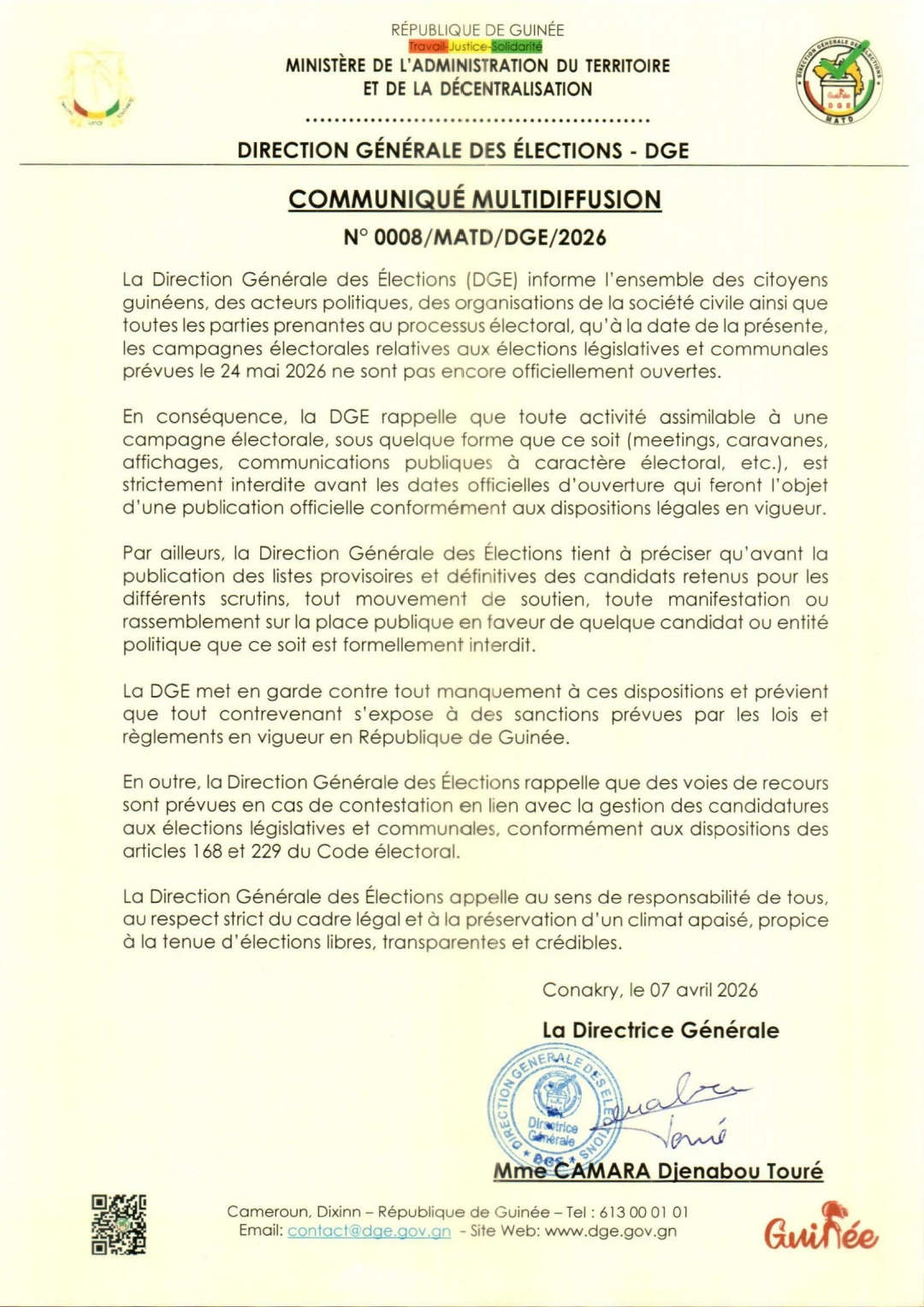 Le paysage politique guinéen est en effervescence, mais pour la Direction Générale des Élections, l’enthousiasme ne doit pas piétiner la loi. Dans son communiqué n° 0008/MATD/DGE/2026, la DGE, sous la plume de sa Directrice Générale, Mme Camara Djenabou Touré, a apporté une clarification majeure : la campagne électorale n’est pas encore ouverte.