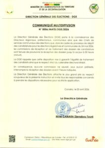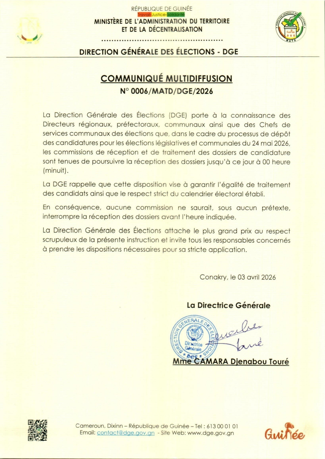 Dans un communiqué officiel (N° 0006/MATD/DGE/2026) publié ce vendredi 3 avril, la Direction Générale des Élections a instruit l’ensemble de ses démembrements de maintenir les bureaux de réception ouverts jusqu’à la dernière seconde de la journée.