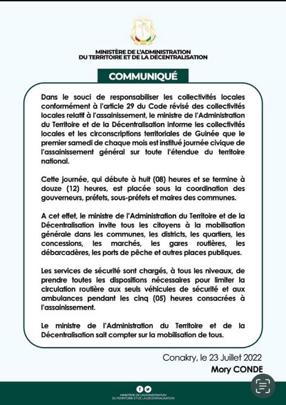 Guinée : le dernier samedi de chaque mois institué journée d’assainissement général (MATD)