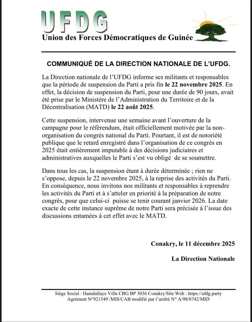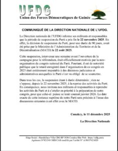 Dans un communiqué publié ce jeudi, 11 octobre 2025, la Direction nationale de l’Union des Forces Démocratiques de Guinée (UFDG) a officiellement annoncé la reprise immédiate de ses activités sur l’ensemble du territoire national. Cette annonce fait suite à l’expiration de la période de suspension imposée au parti par le Ministère de l’Administration du Territoire et de la Décentralisation (MATD).