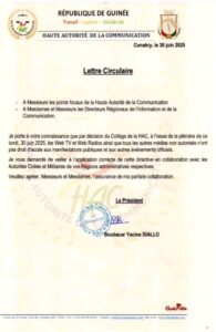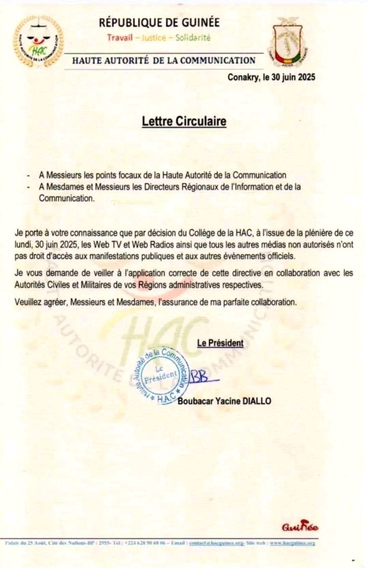 C’est une autre décision de la Haute Autorité de la Communication (HAC) qui vient va faire mal aux Web TV et Web Radios. Dans une lettre circulaire rendue officielle ce lundi 30 juin 2025, le président de la HAC, Boubacar Yacine Diallo a instruit les directeurs régionaux de l’information et de la communication, ainsi que les points focaux de l’institution, de refuser l’accès aux manifestations publiques et événements officiels à tous les médias non autorisés, en particulier les Web TV et Web radios.