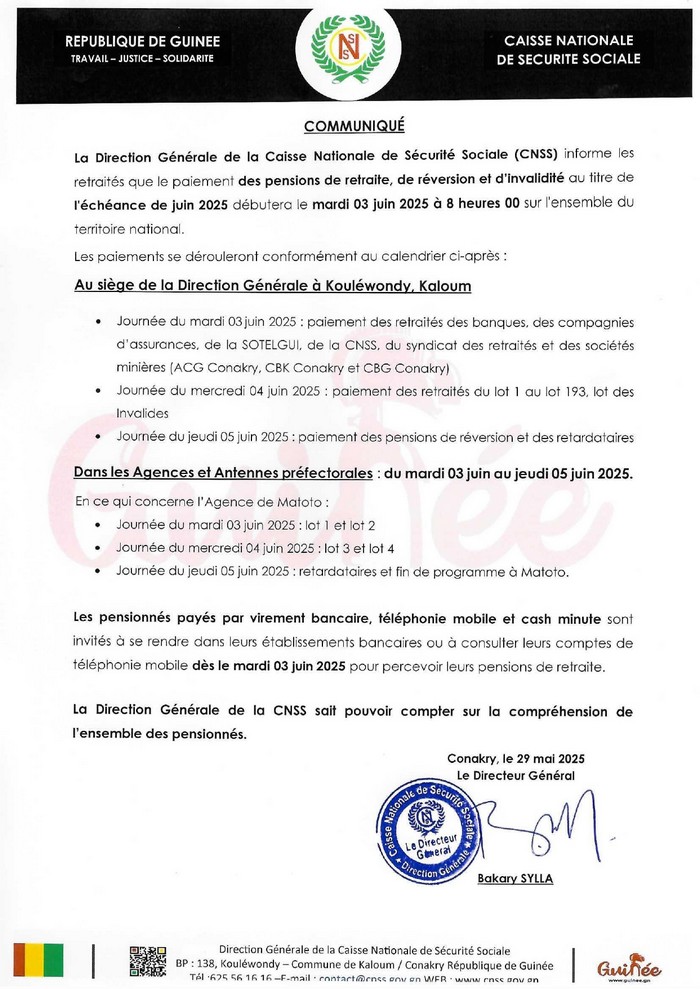 La Direction Générale de la Caisse Nationale de Sécurité Sociale (CNSS) informe les retraités que le paiement des pensions de retraite, de réversion et d’invalidité au titre de l’échéance de juin 2025 débutera le mardi 03 juin 2025 à 8 heures 00 sur l’ensemble du territoire national.