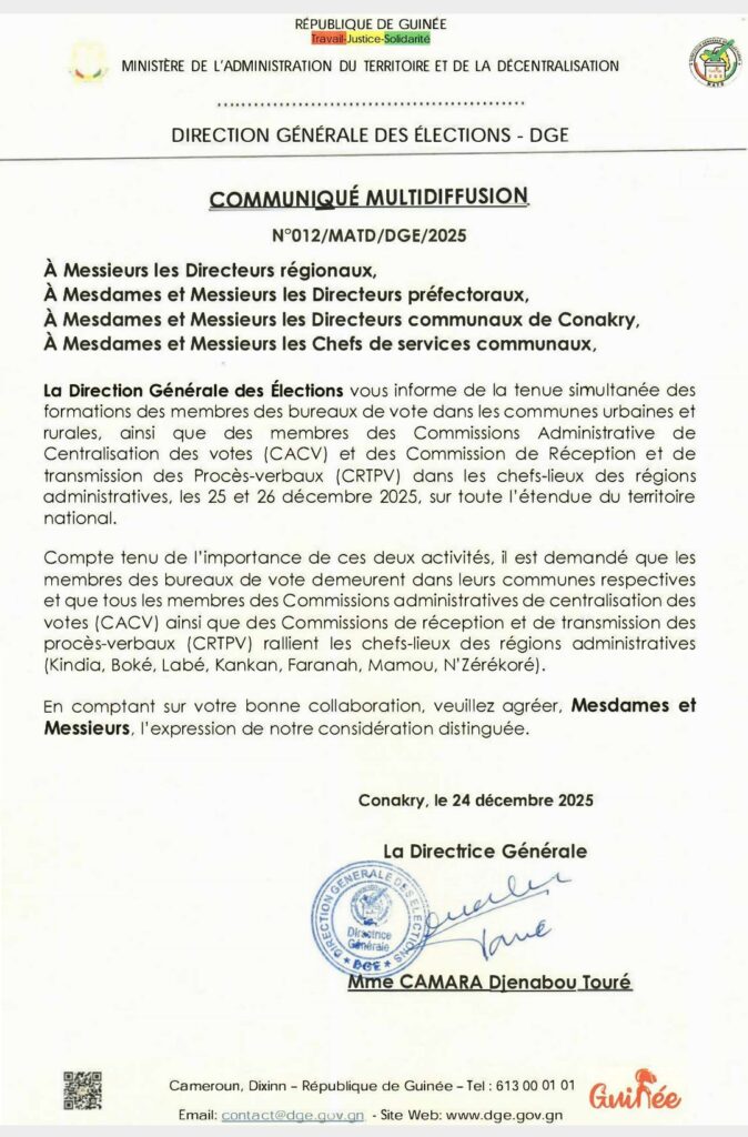 La Direction Générale des Élections vous informe de la tenue simultanée des formations des membres des bureaux de vote dans les communes urbaines et rurales, ainsi que des membres des Commissions Administrative de Centralisation des votes (CACV) et des Commission de Réception et de transmission des Procès-verbaux (CRTPV) dans les chefs-lieux des régions administratives, les 25 et 26 décembre 2025, sur toute l’étendue du territoire national.