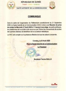 « Dans le cadre de l’organisation du Référendum constitutionnel du 21 Septembre 2025, la Haute Autorité de la Communication (HAC) invite à une Réunion de prise de contact le Mercredi, 27 Août 2025 à 11 heures à son siège, les partis politiques, les plateformes de la société civile reconnus par l’Etat et les mouvements de soutien des opinions désireux de bénéficier de la couverture médiatique”