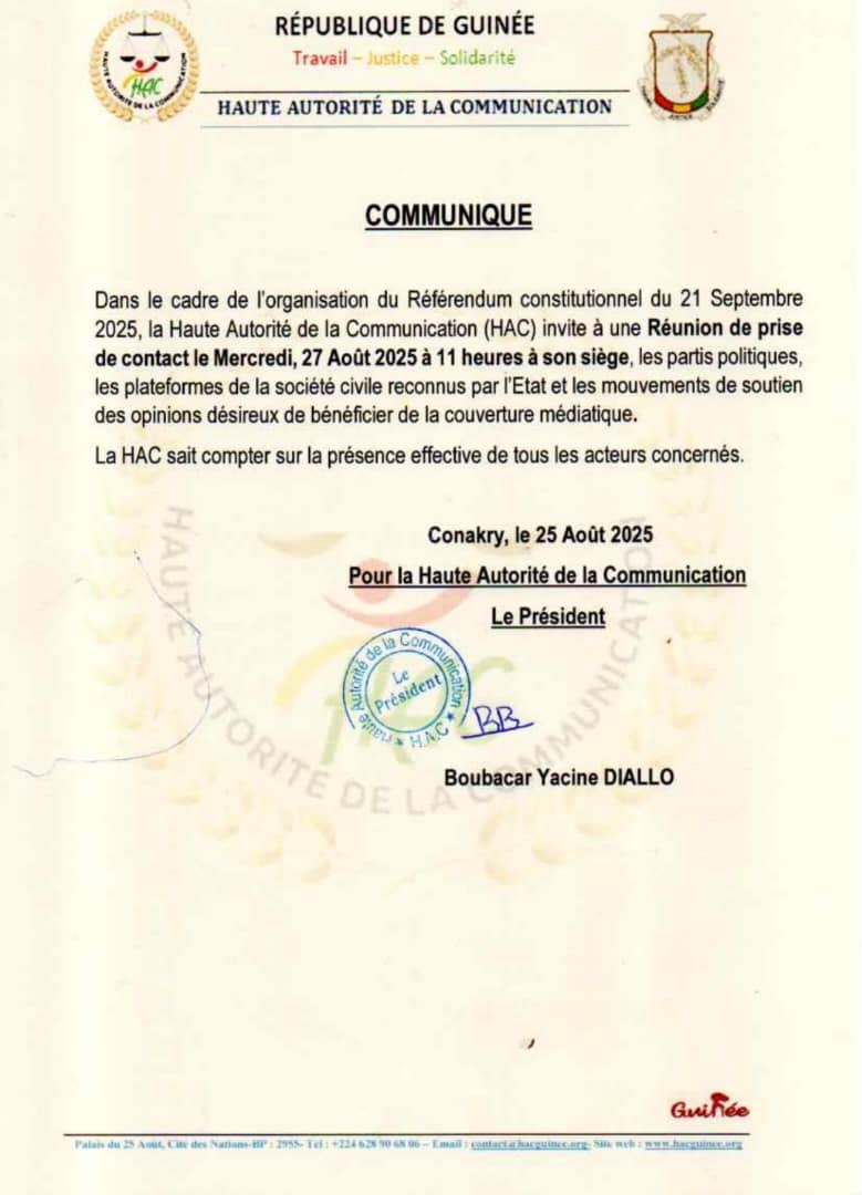 « Dans le cadre de l’organisation du Référendum constitutionnel du 21 Septembre 2025, la Haute Autorité de la Communication (HAC) invite à une Réunion de prise de contact le Mercredi, 27 Août 2025 à 11 heures à son siège, les partis politiques, les plateformes de la société civile reconnus par l’Etat et les mouvements de soutien des opinions désireux de bénéficier de la couverture médiatique”